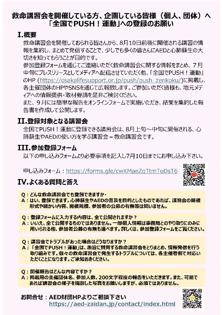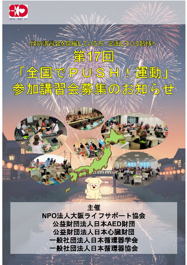 「PUSH project」は、胸骨圧迫(心臓マッサージ)だけの誰でもできる心肺蘇生(そせい)の普及を通じて、突然倒れた方を救命できる地域づくりを目指します。突然死は、いつ、どこでも、誰にでも起こりえます(大阪ライフサポート協会のホームページ参照)。突然心臓が止まってしまった場合、助かる可能性は数%と非常に低く(ウツタイン大阪調べ)、日本では毎年およそ7万人もの方が突然死で亡くなっています。