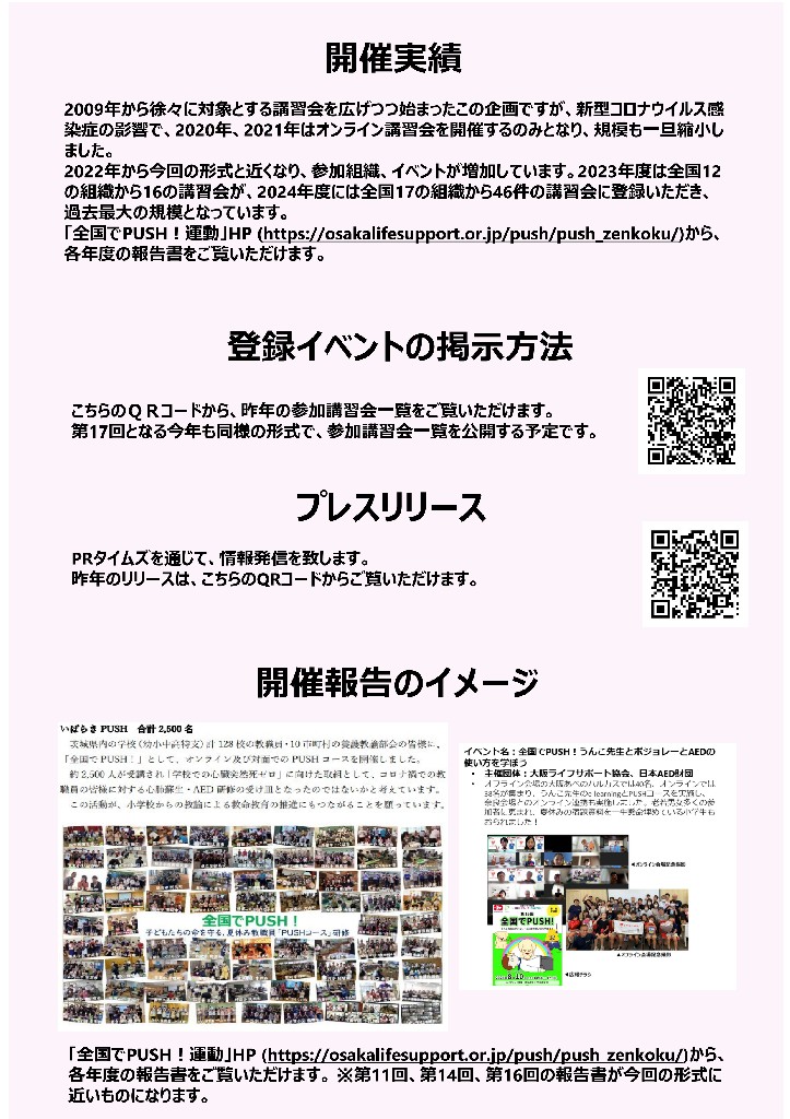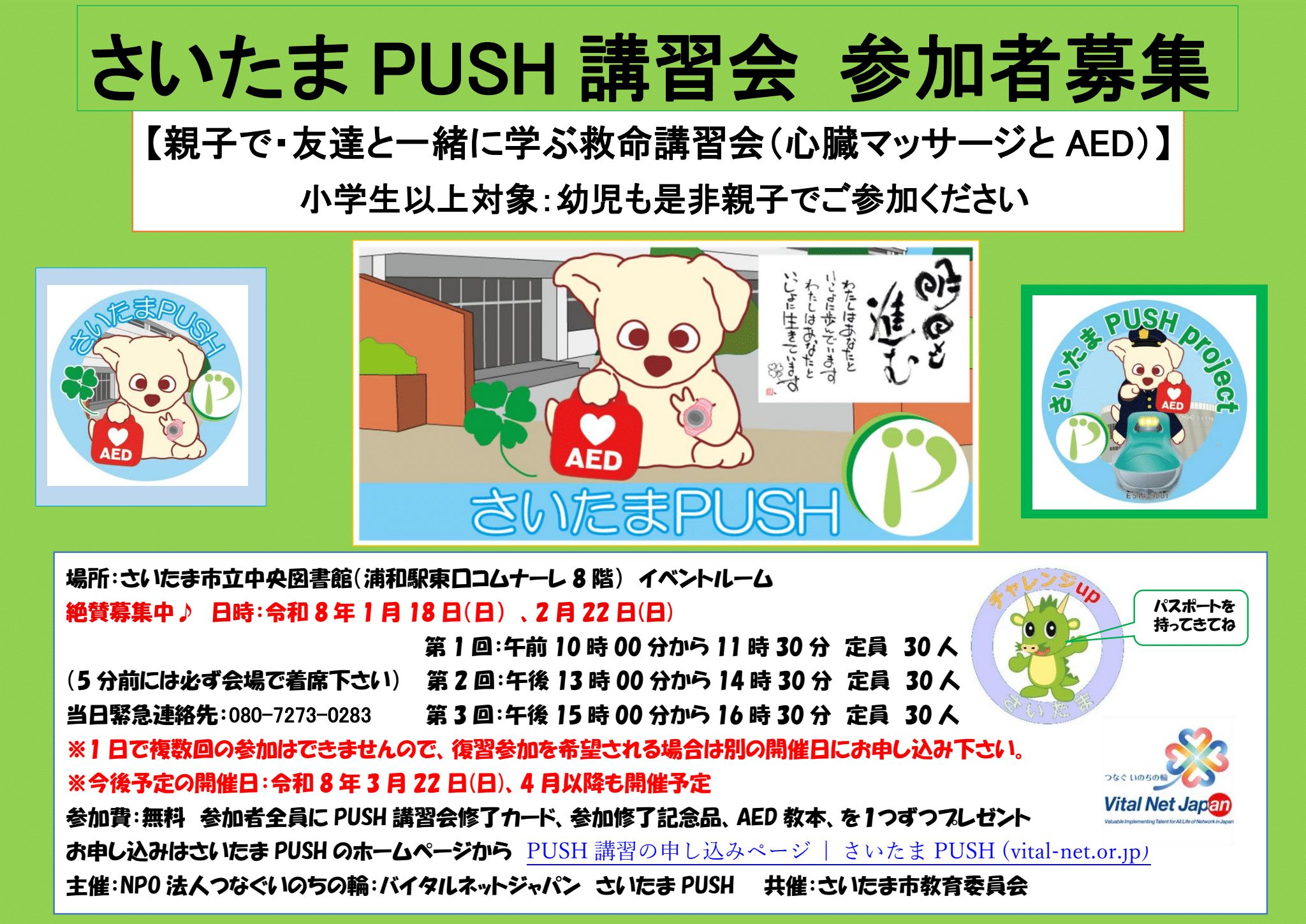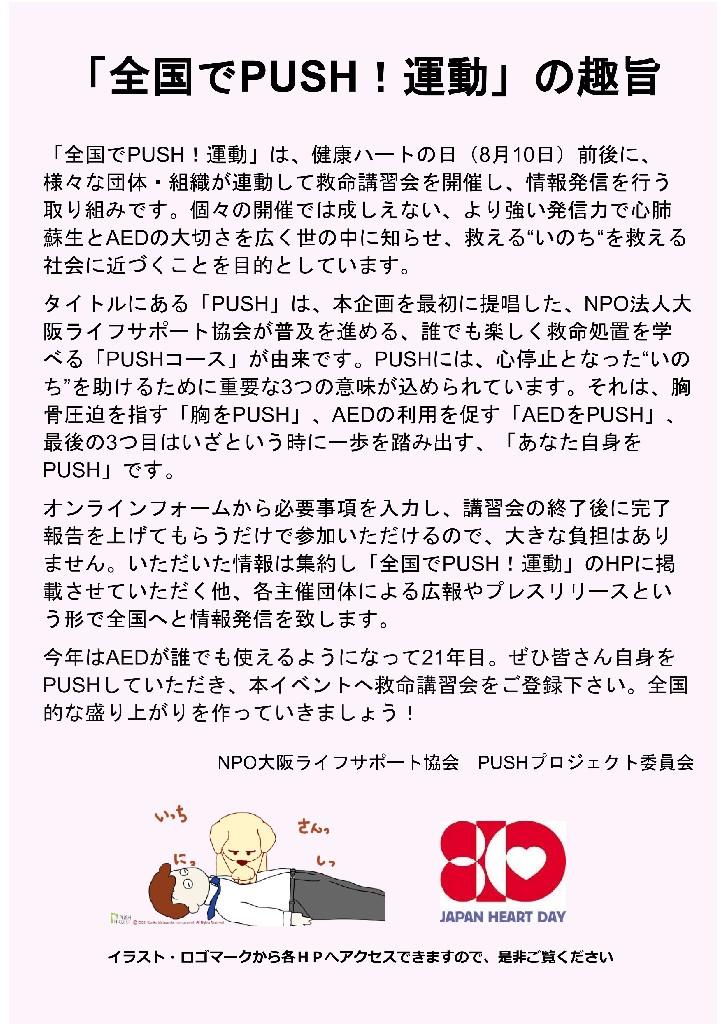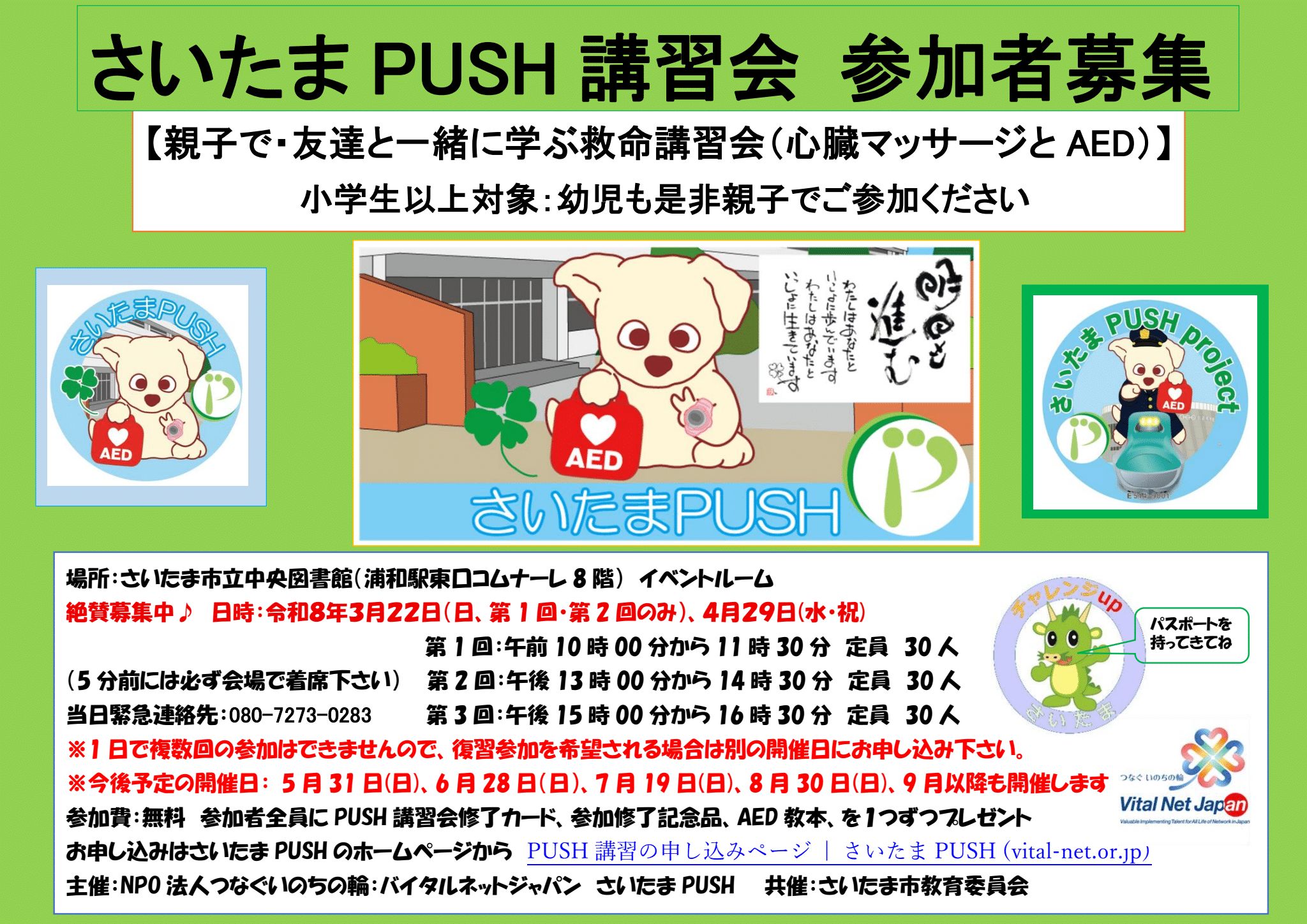 さいたまPUSHは、NPO法人つなぐいのちの輪バイタルネットジャパンの事業として、NPO法人大阪ライフサポート協会が推進する一般市民向け簡易救命講習 PUSH プロジェクトに賛同し、埼玉県を活動拠点としてPUSHプロジェクトの展開を行なっています。